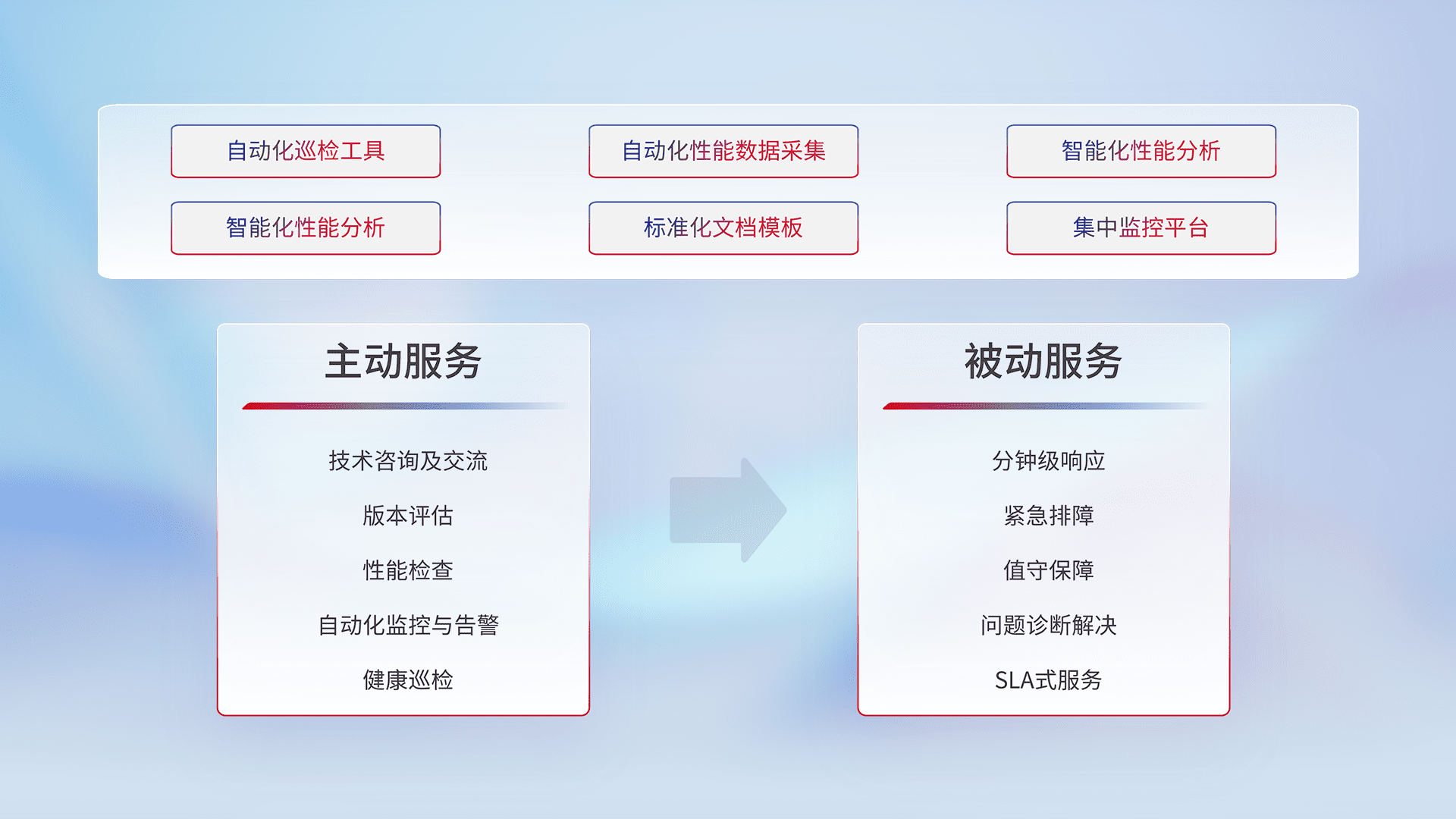 智能化工具和标准化文档,,,保障服务质量,,提供主动服务(包含技术咨询、、版本评估、、、性能检查、、、自动化监控与告警、、、健康巡检)和被动服务包含(分钟级响应、、紧急排障、、、值守保障、、、、问题诊断解决、、SLA服务)。。。。